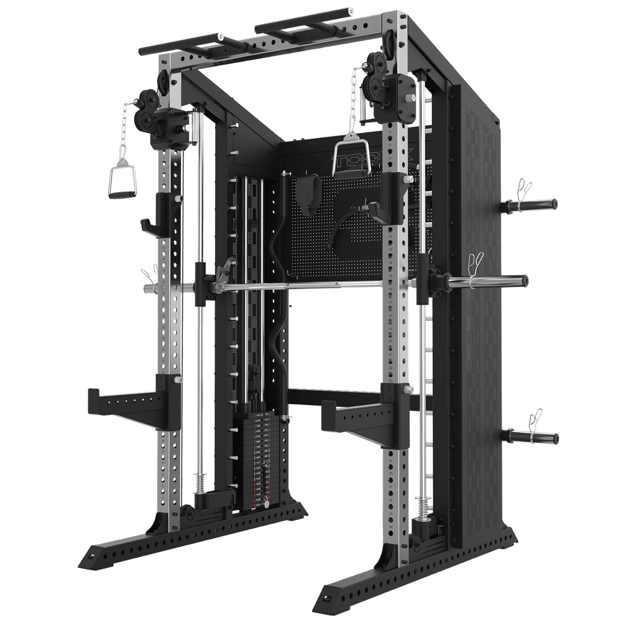 ASX8000 stazione “all in one” posizionata al top della gamma Toorx, adatta ad un utilizzo particolarmente gravoso in ambito full commercial, ASX 8000 racchiude in un’unica stazione le funzioni di tre distinte macchine, ovvero: a) Dual Pulley (equipaggiata di 2 pacchi peso da 90 kg. cadauno) b) Smith machine c) Rack functional corredato di sostegni per il bilanciere, supporti di sicurezza e traliccio per le trazioni Oltre ad essere corredata di serie con numerosi accessori, quest’esclusiva all in one è equipaggiabile con numerosi attachments opzionali estremamente interessanti, tra cui vale la pena segnalare quelli che consentono le funzioni di lat machine e di pulley, con apposita panca doppia funzione, garantendo una completezza d’utilizzo senza pari, unitamente ad un risparmio di spazio e ad una flessibilità impareggiabili.